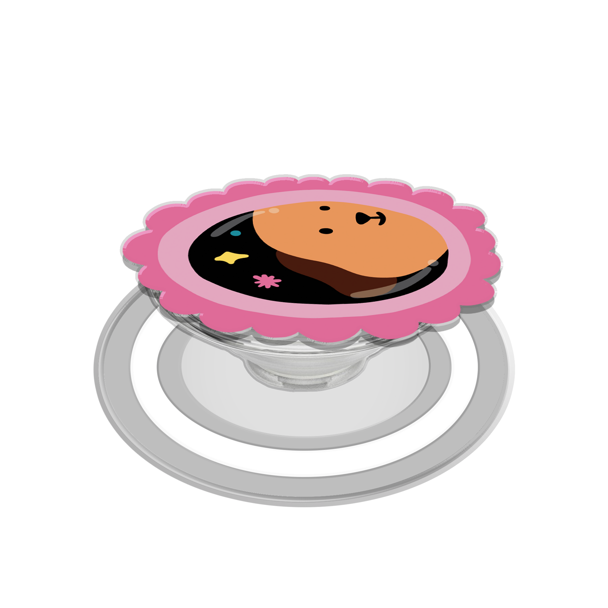 Acrylic with UV-printed for the design with acrylic magnetic based pop up grip, completed with 3M industrial grade to stick it on the back of your phone case.
