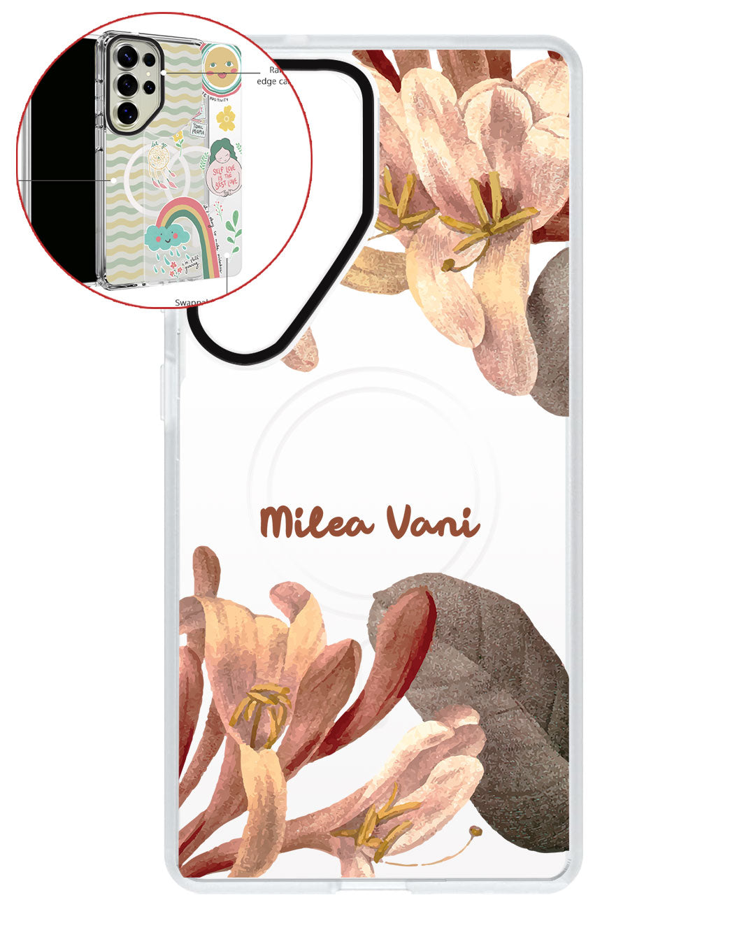 Terbuat dari Akrilik transparan di lengkapi dengan Magsafe / Magnetic yang di print dengan desain pilihan dengan teknologi UV Printing. Magsafe digunakan untuk merekatkan dengan base case / case HP dasar dan untuk support aksesoris berbasis Magsafe.