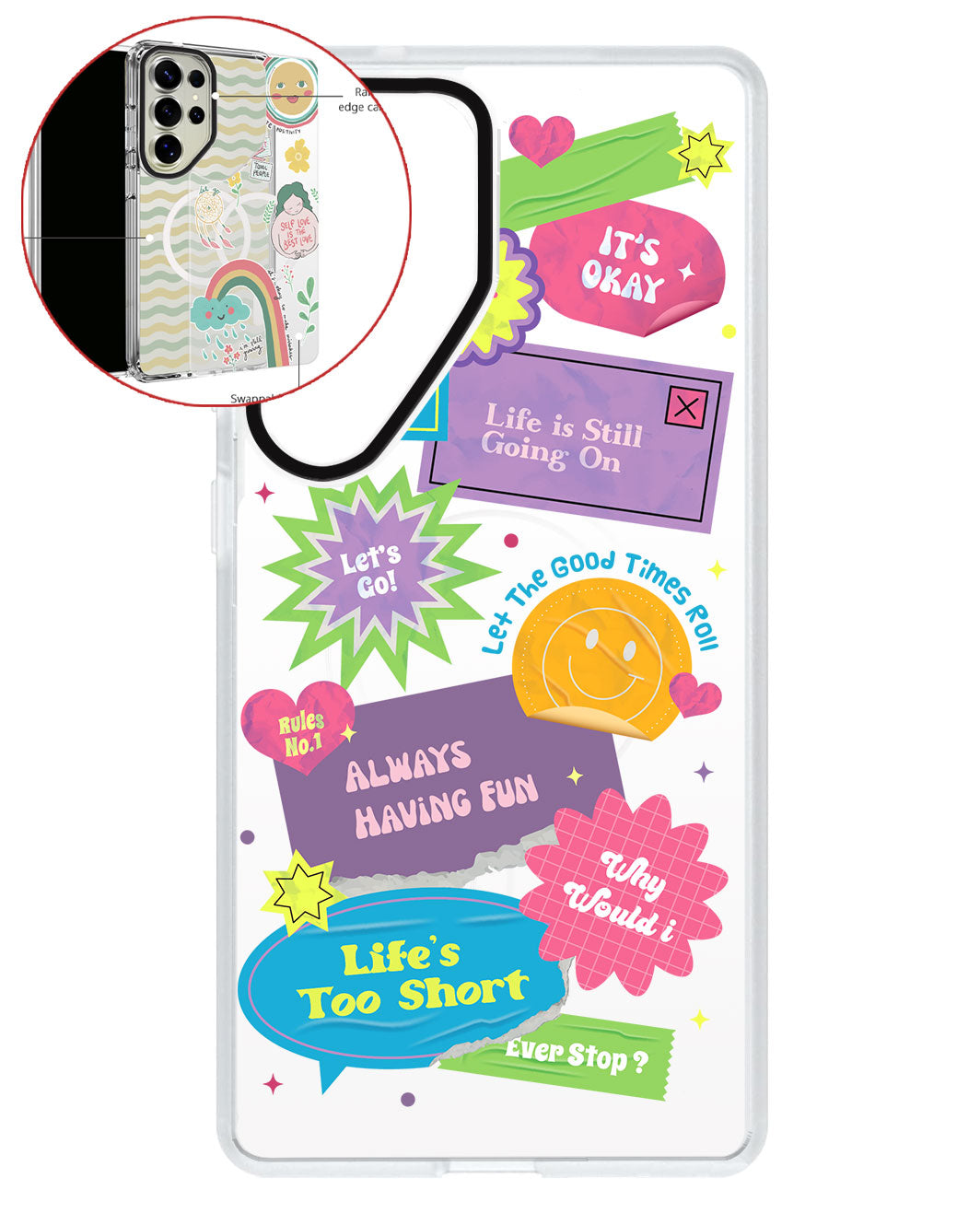 Terbuat dari Akrilik transparan di lengkapi dengan Magsafe / Magnetic yang di print dengan desain pilihan dengan teknologi UV Printing. Magsafe digunakan untuk merekatkan dengan base case / case HP dasar dan untuk support aksesoris berbasis Magsafe.