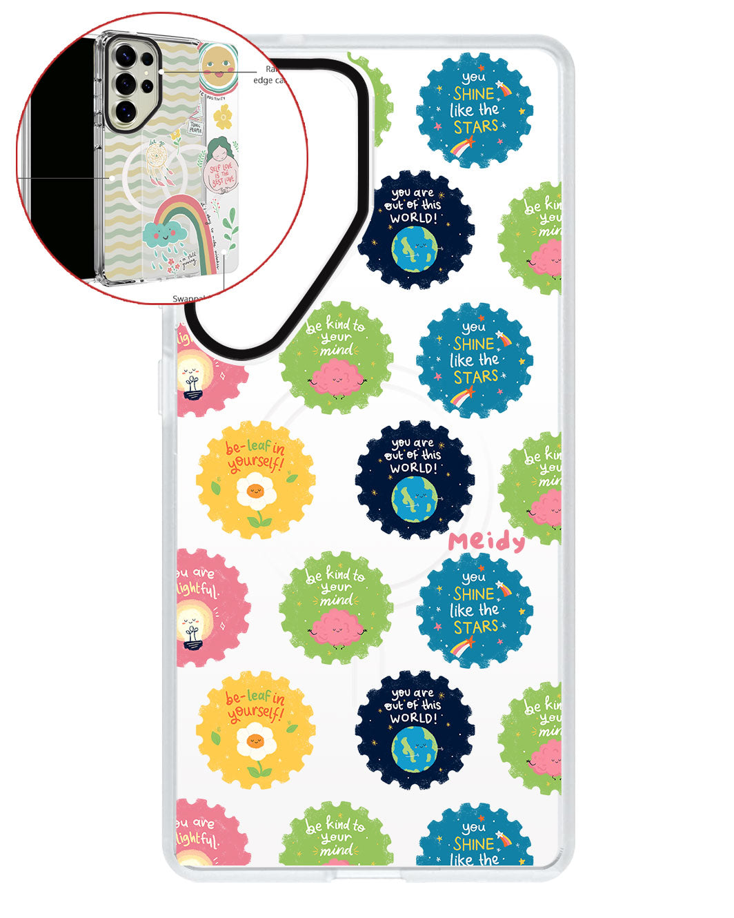 Terbuat dari Akrilik transparan di lengkapi dengan Magsafe / Magnetic yang di print dengan desain pilihan dengan teknologi UV Printing. Magsafe digunakan untuk merekatkan dengan base case / case HP dasar dan untuk support aksesoris berbasis Magsafe.