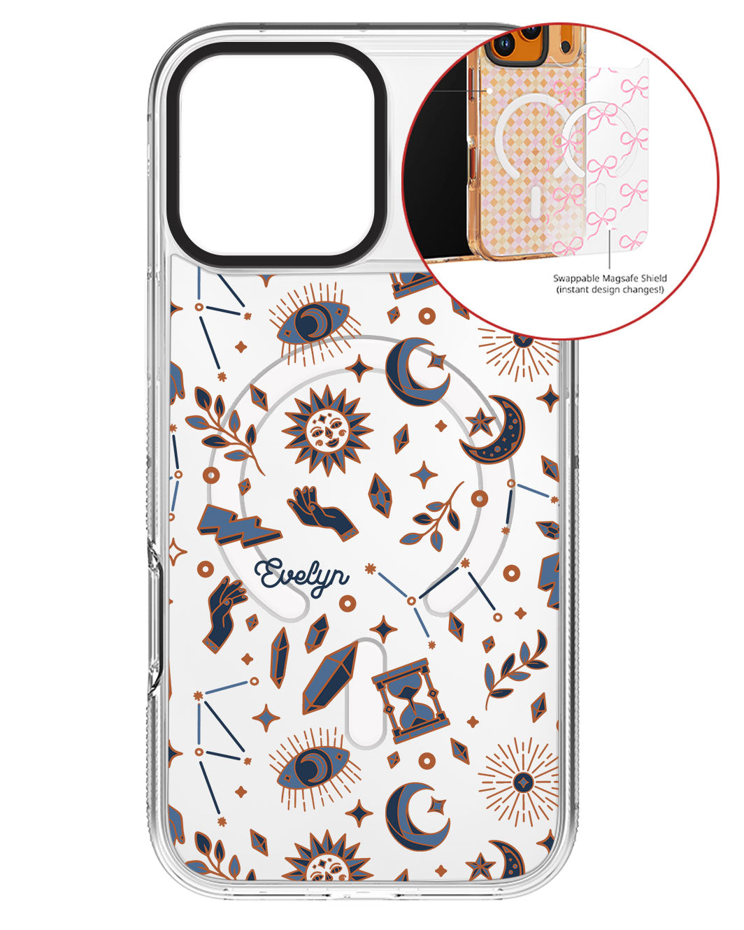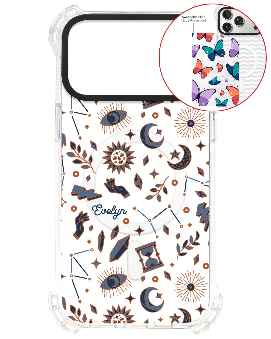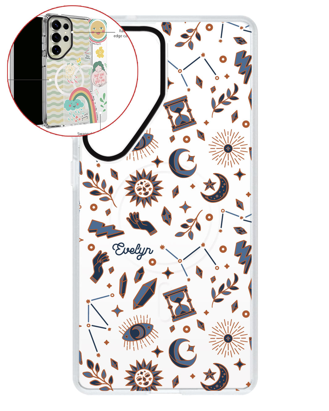 Terbuat dari Akrilik transparan di lengkapi dengan Magsafe / Magnetic yang di print dengan desain pilihan dengan teknologi UV Printing. Magsafe digunakan untuk merekatkan dengan base case / case HP dasar dan untuk support aksesoris berbasis Magsafe.