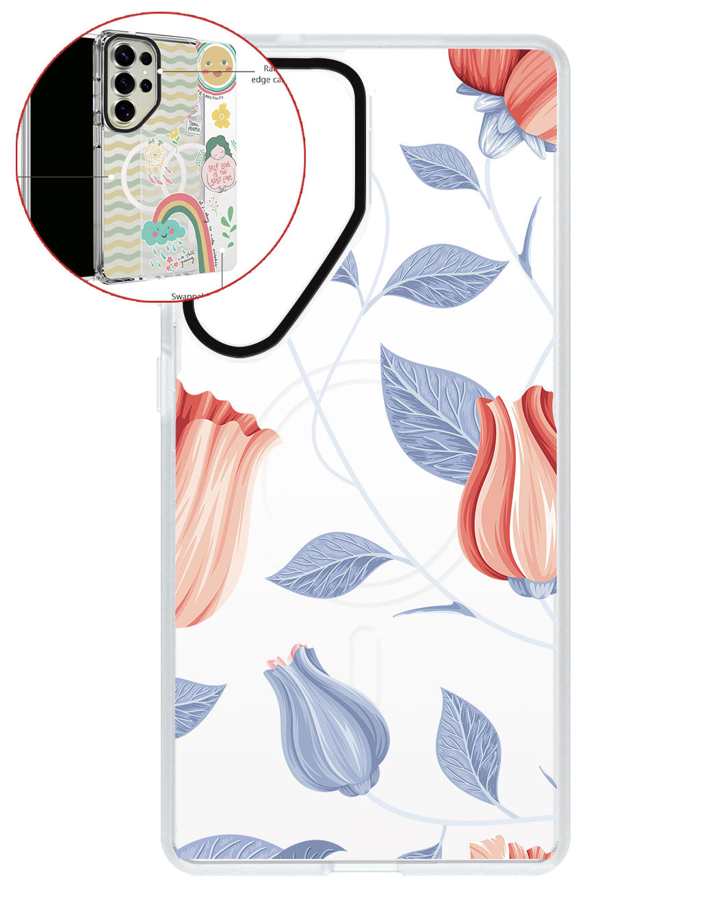 Terbuat dari Akrilik transparan di lengkapi dengan Magsafe / Magnetic yang di print dengan desain pilihan dengan teknologi UV Printing. Magsafe digunakan untuk merekatkan dengan base case / case HP dasar dan untuk support aksesoris berbasis Magsafe.